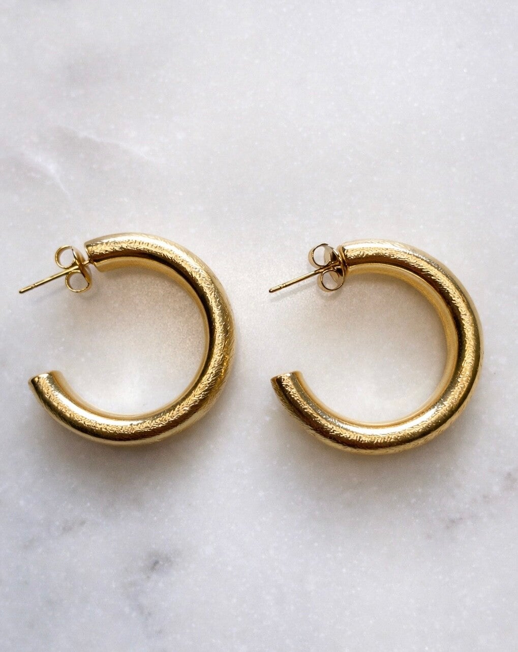 Minimalistische gouden creolen van hoogwaardig stainless steel. met een subtiele textuur voor een luxe uitstraling. Licht, comfortabel en perfect voor elke dag of een chique touch bij je outfit. Tijdloos en makkelijk te combineren ✨